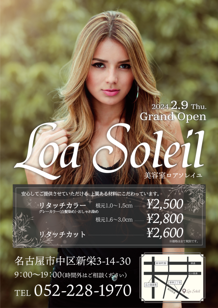 OPEN Campaign 2024.2.9 LoaSoleilがグランドオープン!!近隣住民の皆さまにはキャンペーンチラシを投函させていただいております。クーポンをお持ちの皆さまは、是非一度お気軽にご来店ください。
